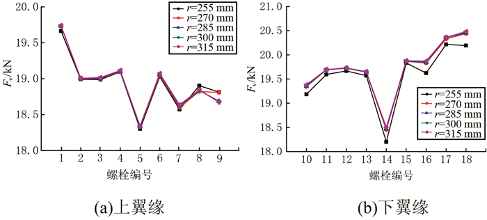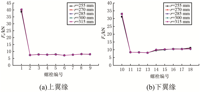 如图 25、26所示,节点盘半径对上、下翼缘螺栓最大螺栓轴力Fn及最大螺栓剪力Fv基本无影响.
