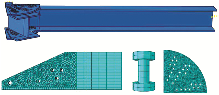 由于建立完整模型,单元数量过多,计算速度慢,又由于试件几何尺寸、支承情况、刚度分布及荷载作用对称,因此在ABAQUS中将模型简化为1/4几何模型,几何模型及模型各部分网格划分如图 4所示.模型各部分的单元及接触类型如表 4所示.