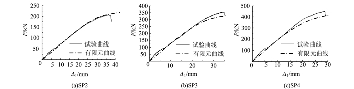 | 图 6 SP2~SP4荷载位移曲线试验与有限元对比 Figure 6 Comparison of load-displacement curves between finite element analysis and experiment results of SP2-SP4 |