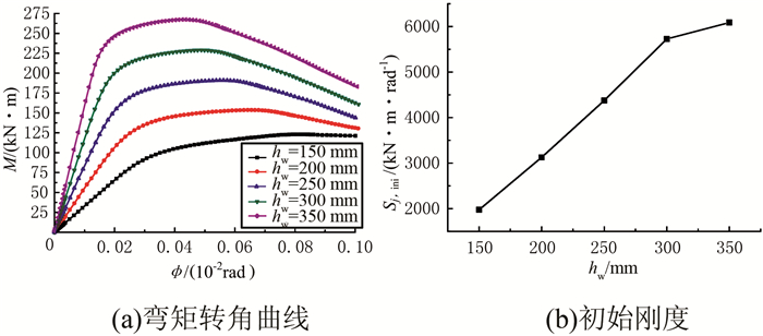 由图 8及表 7可知,相较Sj, ini 150=1 976.99 kN·m·rad-1,腹板高度每提高33.33%,初始刚度提高:58.13%、63.25%、68.31%、18.25%.工字型杆件腹板高度提高,初始刚度增大.hw=150~300 mm,节点初始刚度随着腹板高度的增加而线性提高;hw=300~350 mm,初始刚度随腹板高度增大而提高的提高幅度减小.