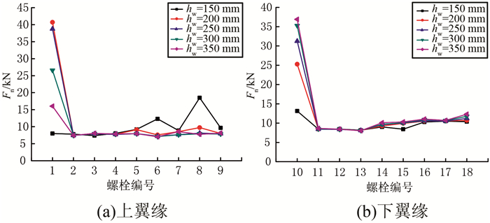 1) 腹板高度的变化对最大螺栓轴力Fn在节点中的分布影响不大,节点上、下翼缘的最大螺栓轴力Fn均表现为1号螺栓最大轴力明显高于其他螺栓,这主要是由于集中力P作用于节点盘中心,靠近节点盘中心的螺栓存在撬力.