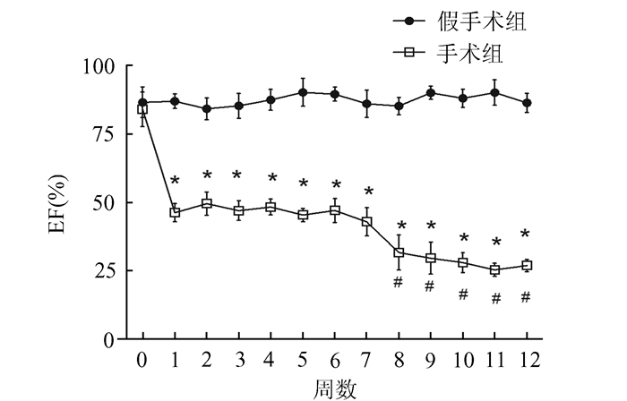 为监测小鼠在手术前后心功能的变化,术前及术后每周同一时间对小鼠进行心脏超声测量。图 2结果表明,手术组小鼠术后1周时EF有明显的减小(P < 0.05),而后基本保持不变,直到术后第8周再次出现下降(P < 0.05),此后大致维持在该水平。假手术组术后EF与术前相比无明显变化。