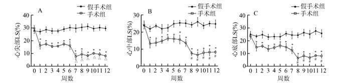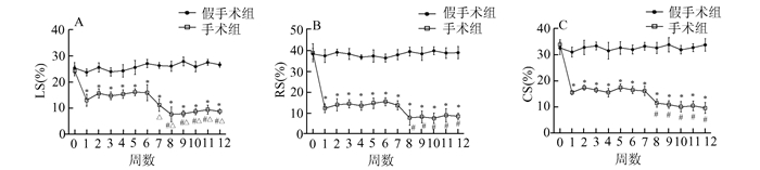 图 3显示,手术组小鼠术后1周时,LS、RS和CS均有显著下降(P < 0.05),此后均在一定时间内大致保持不变。其中,LS在第7周和第8周均有明显的降低(P < 0.05),此后大致维持在该水平,而RS与CS在第7周仍保持不变,直到第8周才开始下降(P < 0.05)。假手术组的LS、RS和CS在手术前后均无明显变化。