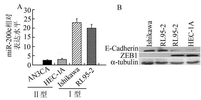 2 结果 2.1 miR-200c、ZEB1和E-cadherin在Ⅰ型(Ishikawa和RL95-2)和Ⅱ型(HEC-1A和AN3CA) EC细胞中的表达及其相关性实时定量RT-PCR结果发现,与Ⅰ型EC细胞(Ishikawa和RL95-2)相比,miR-200c在Ⅱ型EC细胞(HEC-1A和AN3CA)中显著低表达, 表达丰度分别为2.63±0.41和2.83±0.47,如图 1A所示。Western blot结果表明,ZEB1在Ⅰ型EC细胞Ishikawa和RL95-2中不表达,而在Ⅱ型EC细胞HEC-1A和AN3CA中高度表达,表达丰度分别为0.52±0.34和0.81±0.45,而E-cadherin在中Ⅰ型EC细胞高度表达,表达丰度分别为1.58±0.44和1.01±0.36,而在Ⅱ型EC细胞中极低表达,如图 1B所示。