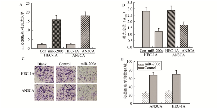 图 2 miR-200c过表达抑制Ⅱ型EC细胞增殖和侵袭 A:pre-miR-200c转染后实时RT-PCR法检测Ⅱ型EC细胞系HEC-1A和AN3CA中miR-200c的表达情况(P < 0.05);B:miR-200c处理明显抑制HEC-1A和AN3CA细胞增殖(P < 0.05);C和D:miR-200c处理明显抑制HEC-1A和AN3CA细胞侵袭(P < 0.05) |
