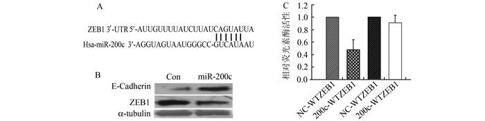 1 材料与方法 1.1 主要材料与试剂Lipofectamine 2000(Lipo2000)、TRIzol、miRNA cDNA逆转录试剂盒、Opti-MEM I培养液(Invitrogen),DMEM培养液(GIBCO)。SYBR GREEN (TOYOBO),Has-miR-200c mimics、miRNA阴性对照(Negative Control)(上海吉玛)。ZEB1兔抗人多克隆抗体和E-cadherin鼠抗人单克隆抗体为Santa Cruz公司产品。