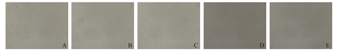 图 1 不同压力对体外培养的Müller细胞的光学显微镜像(×100) A-E:分别代表A-E组 |