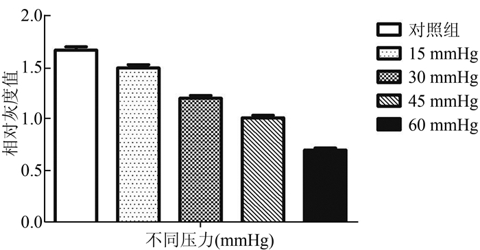 1.4.4 Western blot法检测GLAST的表达采用免疫蛋白印迹法(Western blot)检测各组大鼠视网膜Müller细胞上GLAST的蛋白表达。取对数生长期细胞,5组分别加压0,15,30,45,60 mmHg处理2 h后,制成细胞悬液,以密度1×106个/孔细胞接种于6孔板中,置于37 ℃、5% CO2培养箱中培养24 h。获取培养细胞后,裂解缓冲液抽提蛋白,4 ℃条件下,12 000 r/min 37 ℃孵育1 h,洗涤后加入二氨基联苯胺(DAB)室温避光显色。图像扫描后,应用BandScan软件测定蛋白条带灰度值,以GLAST和β-actin的比值作为相对表达水平。