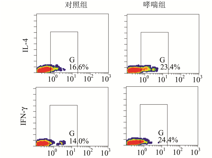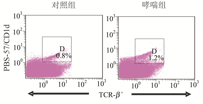 2 结果 2.1 哮喘组与对照组小鼠肺Ⅰ型NKT细胞数量和活性比较哮喘组小鼠肺Ⅰ型NKT细胞百分比与对照组比较差异有统计学意义(P<0.01)(图 1,表 1);以分泌细胞因子的水平表示肺Ⅰ型NKT细胞的活性,哮喘组小鼠IL-4+和IFN-γ+Ⅰ型NKT细胞百分比与对照组比较差异有统计学意义(P<0.05或P<0.01)(图 2,表 1)。