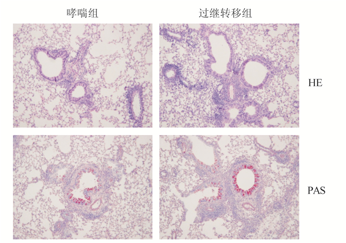 哮喘组小鼠肺组织、气道和血管周围可见炎性细胞浸润,以嗜酸性粒细胞、淋巴细胞为主,肺泡上皮细胞破坏,支气管黏膜增厚、管腔狭窄,气道基底膜可见较多PAS+细胞(杯状细胞);过继转移组小鼠支气管肺组织炎症反应更加明显,气道基底膜PAS+细胞更多(图 3)。