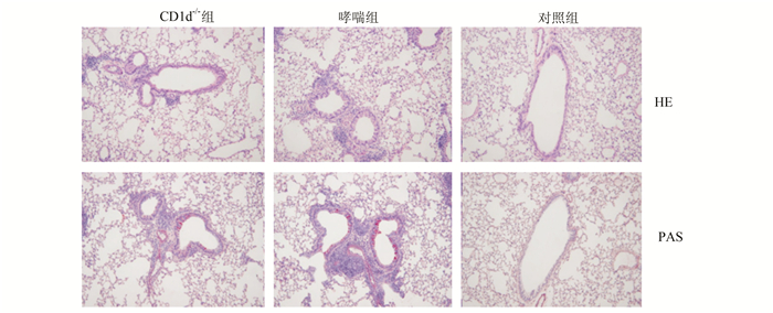哮喘组小鼠肺组织、气道和血管周围可见炎性细胞浸润,以嗜酸粒细胞、淋巴细胞为主,肺泡上皮细胞破坏,支气管黏膜增厚、管腔狭窄,气道基底膜可见较多PAS+细胞(杯状细胞);CD1d-/-组小鼠支气管肺组织炎症反应减轻,气道基底膜PAS+细胞(杯状细胞)减少,但比对照组小鼠更为明显(图 4)。