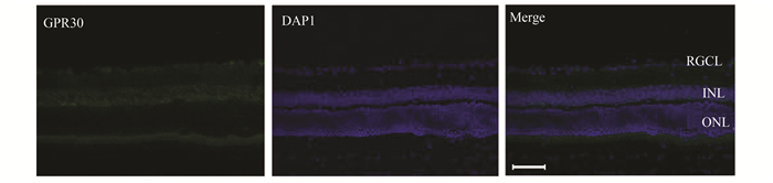 图 1 GPR30受体在C57小鼠视网膜上表达(×400) 绿色为GPR30蛋白,蓝色为DAPI染色细胞核RGCL:视网膜神经节细胞层,INL:内核层,ONL:外核层(图中标尺为50 μm) |