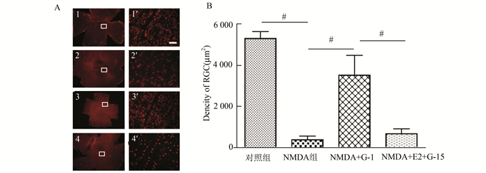 图 2 雌激素膜受体GPR30受体激活后对视网膜神经节细胞凋亡保护作用 A:免疫荧光染色示Brn3a标记神经节细胞(红); A1:对照组; A2:NMDA玻璃体腔注射12 h后,神经节细胞明显减少; A3:G-1皮下注射,并给予NMDA处理,未凋亡的神经节细胞数量增加; A4:G-15和17β-雌二醇皮下注射,并给予NMDA处理,神经节细胞凋亡增多; 图中标尺为100 μm。A1-A4(×20), A1′-A4′ (×200)。B:视网膜未凋亡的神经节细胞密度统计(t检验, P<0.05, n=3) |