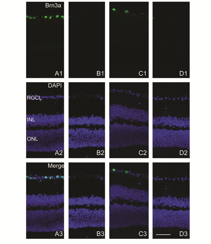 图 3 小鼠视网膜神经节细胞凋亡切片(×400) 免疫荧光示Brn3a标记视网膜神经节细胞(绿); A1-A3:对照组; B1-B3:NMDA玻璃体腔注射12 h后,神经节细胞凋亡明显; C1-C3:G-G1皮下注射后NMDA处理,神经节细胞未凋亡细胞增多; D1-D3:G-15和17β-雌二醇皮下注射后,给予NMDA处理,神经节细胞明显凋亡; 图中标尺为50 μm |