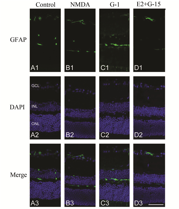 图 4 GPR30抑制Müller细胞增生(×400) 免疫荧光示GFAP标记视网膜Müller细胞(绿) A1-A3:对照组; B1-B3:NMDA玻璃体腔注射12 h后,神经节细胞层中胶质细胞明显增生; C1-C3: G-1皮下注射后NMDA处理,神经节细胞层中胶质细胞减少; D1-D3: G-15和17β-雌二醇皮下注射后,给予NMDA处理,神经节细胞层中胶质细胞增生明显; 图中标尺为50 μm |