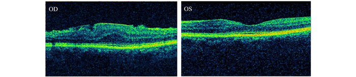 1 病史回顾患者王某,女,75岁。因双眼视力进行性下降50余天收入院。现病史:50余天前出现双眼明显视物模糊,无其他特殊不适,到外院查视力右眼0.2,左眼0.3,未明确病因,给予扩管、营养神经等药物治疗,后视力进一步下降并出现记忆力明显减退,反应迟钝等症状,遂到我院眼科就诊。既往病史为高血压病Ⅰ级。入院检查:①眼科查体:VOD 0.02,矫正视力(BCVA) 0.15+,VOS 0.03(BCVA 0.1),眼压正常,双眼瞳孔直径约2.5 mm,光反射灵敏,晶体及玻璃体轻度混浊,右眼黄斑区呈玻璃纸样反光,左眼黄斑反光暗。②眼科辅助检查:黄斑OCT扫描提示右眼黄斑前膜伴中心凹结构消失(图 1),FFA及ICGA仅提示右眼黄斑前膜,左眼上述检查无异常。VEP提示双眼P100潜时延迟,振幅降低。ERG提示双眼视杆细胞、视锥细胞反应均降低。③全身系统检查:术前常规查血无异常; 头颅MRI平扫+增强提示:双侧基底节区、放射冠区、半卵圆中心、额顶叶皮层下多发腔隙性脑梗塞,增强无明显异常强化; 脑萎缩。