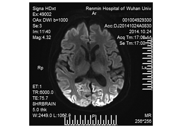 图 2 DWI显示双侧枕顶叶皮层可见对称性高信号 |