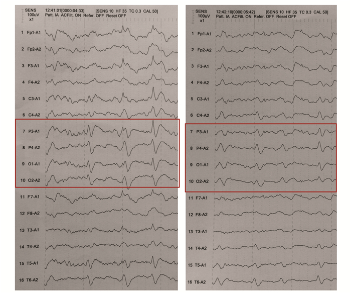 患者入院数天内出现情感淡漠,不能语言交流且运动迟缓,遂请神经内科会诊,检查结果如下:生命体征平稳,颅神经(-),四肢肌张力增高近强直,异常姿势,四肢腱反射低下,深浅感觉正常。追问病史患者半年前有食用生牛肉史。经颅多普勒(TCD)未见异常。MRI-DWI(弥散加权成像,图 2)显示双侧枕顶叶皮层对称性高信号。脑电图提示重度异常脑电图,全头部可见较多慢波、阵发性周期性双向波及三相波(图 3)。脑脊液常规及生化结果正常,寡克隆带阴性。根据上述检查结果并结合患者临床表现,神经内科医师临床诊断为散发型克雅氏病(Creutzfeldt-Jakob disease, CJD)。
