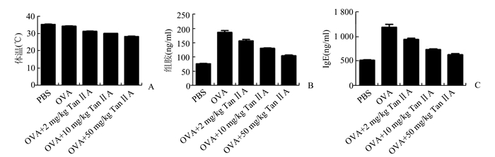 1.4 过敏性鼻炎小鼠模型的建立采用腹腔注射联合鼻腔滴注的方法建立过敏性鼻炎小鼠模型。将小鼠随机分为5组(PBS组,OVA混合物组,OVA混合物+Tan ⅡA 2 mg/kg组,OVA混合物+Tan ⅡA 10 mg/kg组,OVA混合物+Tan ⅡA 50 mg/kg组)。在建模第1天、第8天及第15天分别给予各实验组小鼠腹腔注射200 μl OVA混合物(100 μg OVA+2 mg明矾佐剂+200 μl PBS),对照组小鼠注射200 μl超纯水作为阴性对照。在第22天至第29天,用浓度为40 mg/ml的OVA溶液以鼻腔滴注的方法激发实验组小鼠,每只小鼠滴注20 μl,对照组小鼠同样采用超纯水做阴性对照。造模成功后测量小鼠直肠温度,每10 min测一次,共测8次,80 min后从每个小鼠的腹主动脉采集血标本用于血清组胺、总IgE和OVA-特异性IgE水平检测。