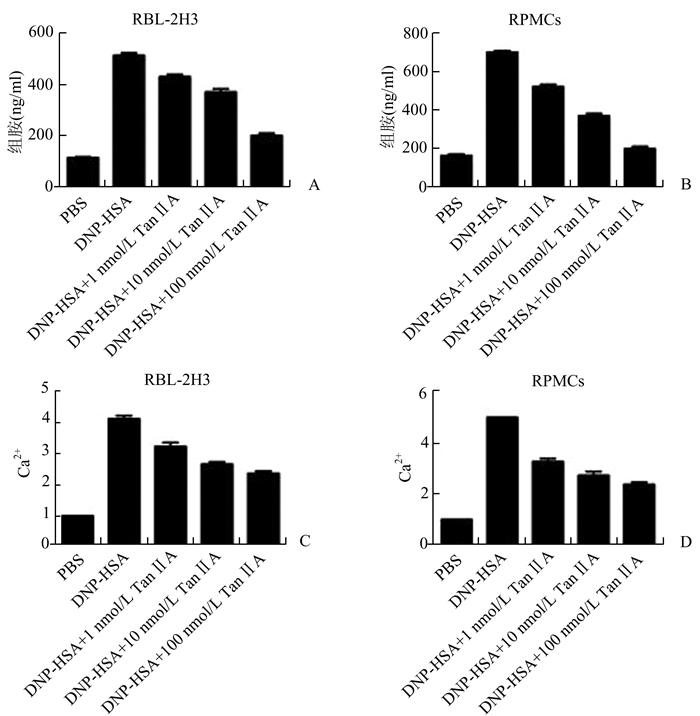 1.6 血清及细胞培养上清中组胺检测将抗-DNP IgE (100 ng/ml)致敏的小鼠用Tan ⅡA预处理1 h后用DNP-HSA (100 ng/ml)刺激4 h,收集小鼠静脉血于4 ℃ 4 000 r/min离心15 min收集血清。将分离的RPMCs接种于含有anti-DNP IgE (500 ng/mL)的24孔板中(2×104细胞/孔)。24 h后,用PBS洗涤细胞,再用Tan ⅡA预处理1 h,然后再用DNP-HSA (100 ng/ml)刺激30 min,4 ℃ 1 500 r/min离心5 min收集细胞上清。为检测血清和细胞培养上清中的组胺浓度,在血清和细胞培养上清中加入0.1 mol/L HCl和60%高氯酸然后离心,并将上清转移到1.5 ml EP管中,在EP管中加入5 mol/L NaCl, 5 mol/L NaOH和n-丁酸,旋涡混匀后离心。在上清中加入0.1 mol/L HCl和n-haptane充分混匀后再离心。用荧光板阅读器(Molecular Devices)读取440 nm发射波长和380 nm激发波长处的荧光强度。