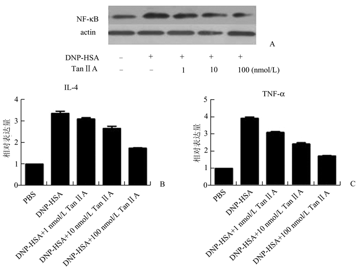 过敏性鼻炎作为一种炎性疾病,其发生时必然伴随着参与过敏过程的细胞内炎症通路的激活[8]。而NF-κB及MAPK通路是经典的两条炎症信号通路。炎症发生时,通过激活该信号通路介导下游大量炎症因子的分泌[9, 10]。之前的研究结果表明Tan ⅡA可通过抑制肥大细胞的生物学行为来缓解过敏性鼻炎的症状,但其作用机制并不明确。本研究通过测定NF-κB及下游炎症细胞因子的表达量研究Tan ⅡA对NF-κB通路及下游炎症因子的影响,来探究NF-κB通路是否参与Tan ⅡA抑制肥大细胞生物学行为的作用,结果发现Tan ⅡA可通过抑制NF-κB通路的激活并下调下游炎症因子IL-4及TNF-α的表达。鉴于以上实验数据,Tan ⅡA是如何与肥大细胞发生作用仍需要作进一步的研究,这也将是本课题组下一步将要开展的工作。