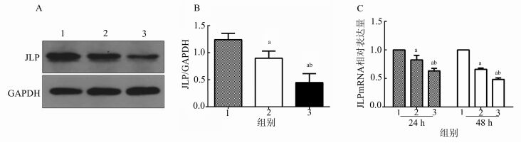 图 1 不同剂量X线干预HK-2细胞后JLP表达改变 1:对照组(无射线干预组);2:4 Gy X线干预组;3:6 Gy X线干预组;A、B:Western印迹法检测不同剂量X线干预后HK-2细胞JLP表达变化,与对照组比较,aP<0.05,与4 Gy X线干预组比较,bP<0.05;C:实时荧光定量PCR检测不同剂量X线干预24 h、48 h,检测JLP mRNA表达,与对照组比较,aP<0.05,与4 Gy X线干预组比较,bP<0.05 |