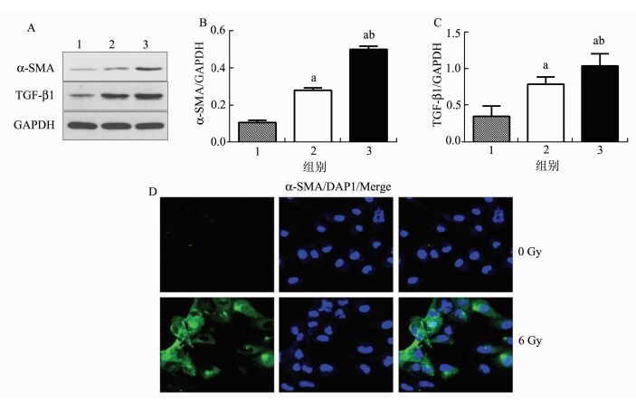 图 2 辐照后各组HK-2细胞TGF-β1和α-SMA表达改变 1:对照组(无射线干预组);2:4 Gy X线干预组;3:6 Gy X线干预组A:Western Blot;B、C:A图的定量分析,与对照组比较,aP<0.05,与4 Gy X线干预组比较,bP<0.05;D:免疫荧光 |