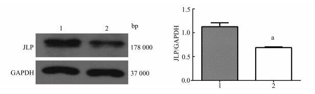 图 3 辐照后肾组织JLP表达变化 1:对照组(非辐照组);2:辐照组;与对照组比较,aP<0.05 |
