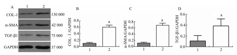 1.4 Western印迹收集并提取细胞以及组织蛋白,BSA法测蛋白浓度,配制10%分离胶进行电泳,用微量加样器将制备好的蛋白样品和Marker加入上样孔, 各样品总蛋白量约为40 μg。加样后先恒压80 V电泳至浓缩胶与分离胶交界处,改为恒压120 V至指示剂到凝胶底部。随后进行转膜,转膜条件:GAPDH:200 mA,90 min;JLP:200 mA, 120 min后300 mA, 60 min;α-SMA:200 mA,90 min;TGF-β1:200 mA,90 min,COL-Ⅰ:200 mA, 120 min后300 mA, 30 min。转膜成功后5%脱脂牛奶封闭1 h,TBST洗膜3次,将PVDF膜分别置于抗体稀释液稀释后的一抗中,4 ℃孵育过夜,抗体稀释浓度:兔抗GAPDH抗体(杭州至贤生物有限公司,1:1 000),兔抗JLP抗体(Abcam,1:1 000),兔抗TGF-β1抗体(北京博奥森生物技术有限公司,1:200);兔抗α-SMA抗体(Abcam,1:25 000),兔抗COL-Ⅰ抗体(Abcam,1:7 500)。TBST洗膜3次,随后二抗孵育1 h,TBST洗膜3次,曝光。