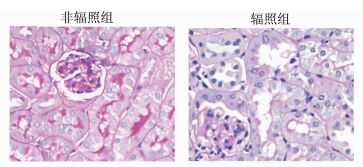 近年来骨髓移植前全身照射预处理以及肿瘤放疗导致放射性肾损伤的发病率逐渐增加。早期放射性肾损伤主要表现为肾小管上皮细胞脱落、坏死、再生,随着病情演变逐渐进展至肾小球硬化、肾小管萎缩、间质纤维化等慢性肾脏病改变,肾小管间质在放射性肾损伤的发病中起重要的作用[10, 13]。