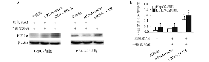 免疫蛋白印迹检测(图 4)显示,转染siRNA-SOCS,抑制肝癌细胞SOCS表达后,在联合脂氧素A4的Hanks平衡盐溶液培养下,HepG2和BEL7402细胞仍显著表达HIF-1α(P<0.05)。
