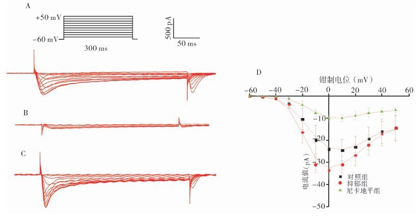图 1 结肠平滑肌细胞膜上ICa-L及其I-V曲线变化 A.对照组;B.尼卡地平组;C.抑郁组;D.各组I-V曲线比较 |