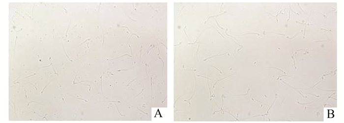 图 2 小鼠精子凝集实验 A:未免疫血清与小鼠精子反应; B:mCRISP 1抗血清(1:10稀释)与小鼠精子反应。两组精子均未见明显凝集现象(×200) |