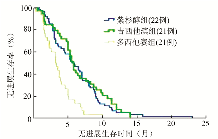 2 结果 2.1 治疗有效率及临床受益率比较见表 2。紫杉醇组临床受益率高于吉西他滨组及多西他赛组,差异有统计学意义(P<0.05);3组治疗有效率比较差异无统计学意义(P>0.05)。