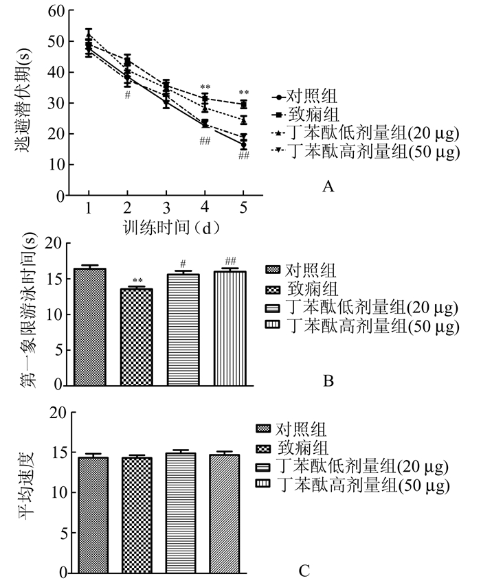 训练期每天记录的大鼠在4个象限的平均潜伏期反映了大鼠的学习能力。ANOVA分析提示组间(P<0.05)和组内(P<0.01) Morris水迷宫的平均潜伏期有明显差异(如图 1A所示)。Bonferroni posttest检验结果表明,致痫组大鼠在训练的第4天和第5天找到平台的时间显著多于对照组大鼠,差异有显著性意义(均P<0.01);而与致痫组大鼠相比,丁苯酞高剂量组在训练期的第2天,第4天和第5天找到平台的时间明显减少,差异有显著性意义(P<0.05;P<0.01)。这些研究结果说明致痫组大鼠在Morris水迷宫中的空间学习能力出现了损害;而高剂量丁苯酞可以减少致痫组大鼠的空间学习时间。