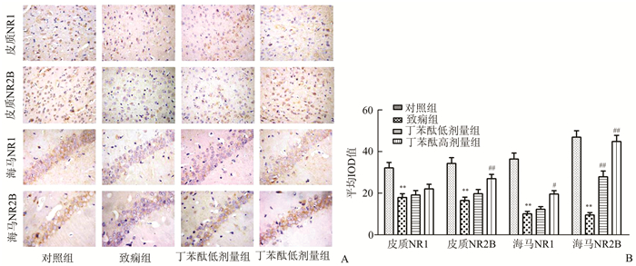 1.6 免疫组化染色免疫组化染色采用SABC法。切片常规脱蜡至水洗;0.01 mol/L Tris-EDTA缓冲液微波修复后,3%H2O2室温孵育10 min;滴加5% BSA (牛血清白蛋白)37 ℃封闭20 min;滴加兔多克隆抗体NR1(1:500;ab17345,Abcam公司,美国)和NR2B (1:500;ab65875,Abcam公司,美国)约50 μl覆盖到组织,4 ℃过夜;50-100 μl A液室温下孵育45 min;50-100 μl新鲜配制的DAB溶液,显微镜控制显色。空白对照实验:除用PBS代替一抗外,其余步骤均相同,结果为阴性。免疫组化染色阳性反应为细胞膜呈黄棕色。Image-Pro Plus 6.0图像分析软件测量目标区域阳性细胞的积分光密度值,分析NR1和NR2B的表达。