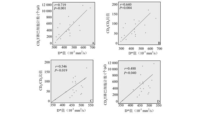 HIV+组尾状核D*值与CD4+T淋巴细胞计数呈显著正相关(r=0.719,P=0.001,图 4A),HIV+组尾状核D*值与CD4/CD8比值呈显著正相关性(r=0.640,P=0.004,图 4B);HIV组额叶白质D*值与CD4+T淋巴细胞计数呈显著正相关(r=0.488,P=0.040,图 4C),HIV+组额叶白质D*值与CD4/CD8比值呈显著正相关性(r=0.546,P=0.019,图 4D)。HIV+组尾状核和额叶白质D值和f值与CD4+T淋巴细胞计数及CD4/CD8比值无显著相关性。