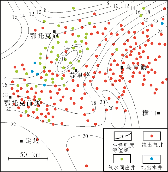 图 1 区域生烃强度与产水井分布关系 Fig. 1 The relation between hydrocarbon-generating intensity and the distribution of producing wells in the Sulige region |