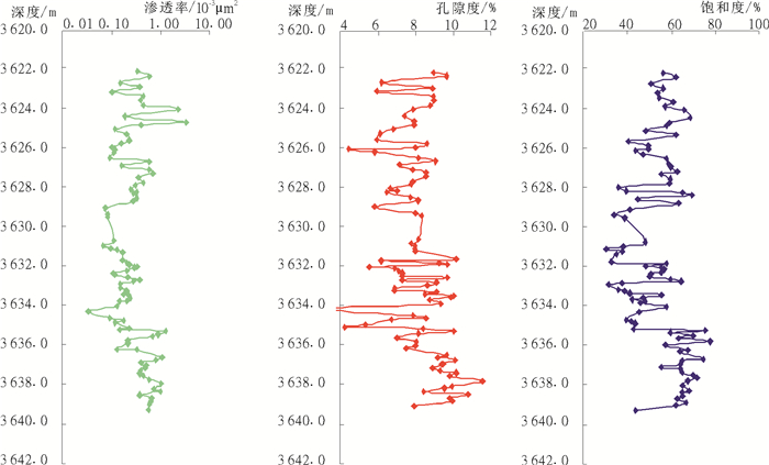 图 3 S-YQE井单砂体孔渗饱纵向分布(密闭取心91块样) Fig. 3 Porosity, permeability, saturation plot in single layer of Su-YQE well |