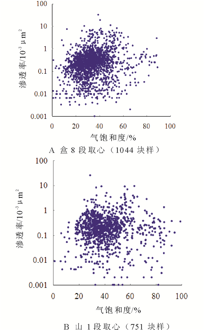 本研究将多井、多段储层的物性与含气饱和度进行交会, 发现二者之间没有明显的相关性(见图 4)。分析认为, 物性与含气性正相关的前提是其他成藏要素相同或差别不大; 而苏里格气田的生排烃强度、充注方式、充注强度、物性以及孔喉结构都具有不同程度的差异, 含气饱和度的影响因素较多, 所以物性不是含气差异性的唯一控制因素, 对含气性没有绝对控制作用。因此, 在多井、多段储层内, 物性与含气性的关系复杂, 没有明显的正相关性。