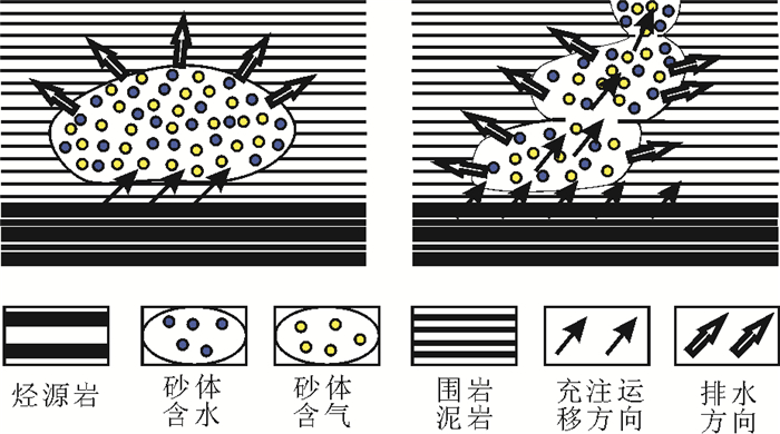 由于充注方式的不同, 储层的含气饱和度也可能有所区别:一是因储层致密存在非达西流, 使储层不同部位获得非均质充注[24-29]。二是由于源岩与储层、储层与储层之间的配置关系多样化, 致使充注方式不同, 最终体现为含气饱和度的差异性。砂岩透镜体相对封闭, 持续充注过程中气含量不断累积, 含气饱和度可能较高; 连通性好的空间叠置砂体或河道砂体, 由于砂体的封闭性不足, 充注时则可能通过最佳运移通道继续向上或侧向运移(见图 5)。
