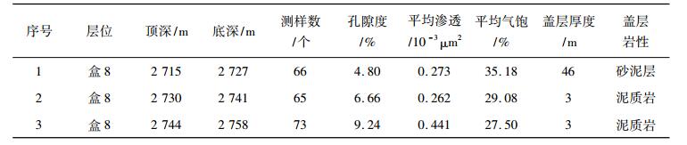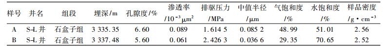 由于盒8段、山1段为岩性集群式成藏, 不同区块、不同层位、不同砂体的沉积背景、成岩演化存在差异, 所以储层的孔喉结构并不一致。在同等成藏条件下, 被相对宽大的喉道连通的孔隙可以被较好地充注, 被相对窄小的喉道连通的孔隙难以充足, 含气性差于前者。储层大孔喉的比例高, 同等成藏条件下含气饱和度也高。如苏里气田中区发现井S-L井的单层砂体内, A样块与B样块取样间隔约2 m, 孔隙度与渗透率无明显差别, 但中值半径A样块远大于B样块, 大孔喉相对更发育, 因此在同等成藏条件下含气饱和度明显更高(见表 2)。