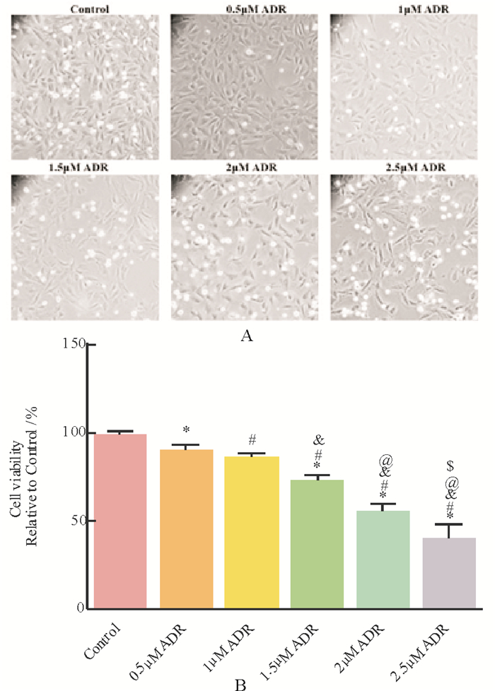2 结果 2.1 ADR处理可以引起心肌细胞损伤不同浓度ADR损伤可显著降低H9c2细胞活力, 并呈浓度依赖性(与Control组相比, P < 0.05), 中当ADR浓度为2μM时, 细胞活力下降约50%, 损伤程度合适, 将该浓度用于进一步实验(图 1)。