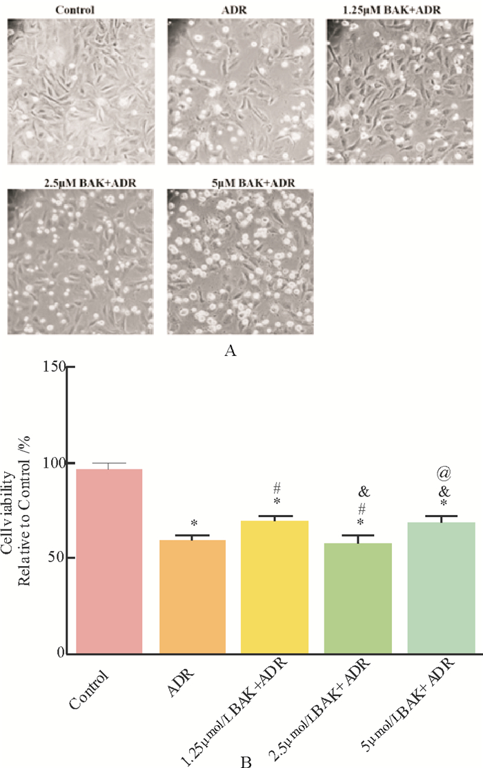 1.2.2 实验分组及给药方式细胞实验分为3组, 即对照组(Control组); ADR处理组(ADR组); 不同浓度BAK保护组(BAK+ADR组)。BAK溶解于DMSO, ADR溶解于DMEM, 对照组加入等体积的DMSO。