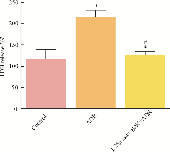 采用LDH检测试剂盒检测H9c2心肌细胞上清液中LDH水平。与Control组相比, ADR组心肌细胞培养液中LDH水平明显上升(P < 0.05), 而BAK处理可逆转此效果(图 3)。