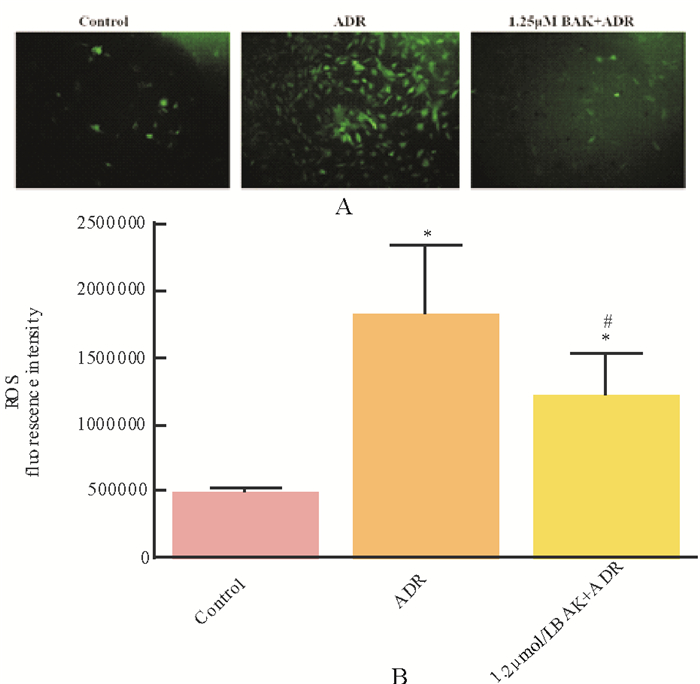 采用活性氧检测试剂盒检测H9c2心肌细胞内ROS水平。结果显示, 与Control组相比, ADR组心肌细胞内ROS水平明显上升(P < 0.05), 而BAK处理可以明显降低ADR引起的心肌细胞内ROS水平(P < 0.05)。