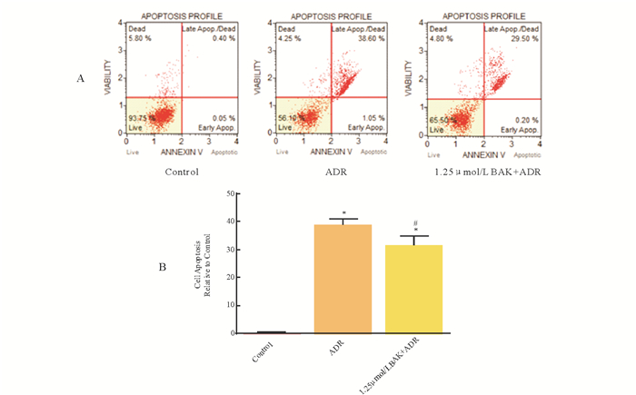 A为MUSE细胞活力分析仪检测结果; B为细胞凋亡统计图。结果用mean±SD表示, n=6。* vs. Control, P < 0.05;# vs. ADR, P < 0.05。 图 5 BAK对ADR损伤后细胞凋亡率的影响 Fig. 5 Effects of bAK on the cell apoptotic rate unjured by ADR |