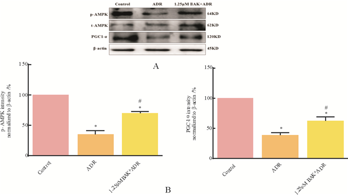A为典型的Western blot条带图, B为各条带灰度值统计图。结果用mean±SD表示, n=3。* vs. Control, P < 0.05;# vs. ADR, P < 0.05。 图 6 BAK对ADR损伤后细胞中AMPK/PGC-1α信号通路相关分子的影响 Fig. 6 Effects of BAK on the AMPK/PGC-12 signaling pathway in jured by ADR |