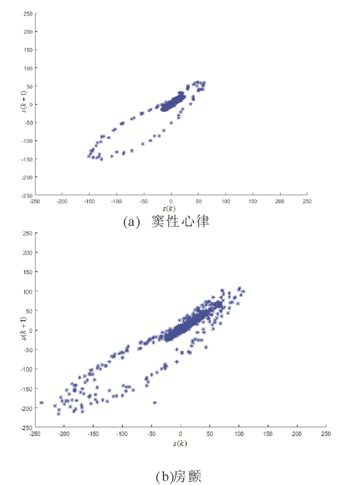 图 4 窦性心律、房颤发作时对应的散点图 Fig. 4 The corresponding scatter diagramof sinus rhythm and atrial fibrillation |