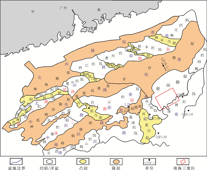 珠江口盆地靖海凹陷位于东沙隆起之南, 西临兴宁凹陷, 北东接揭阳凹陷, 南东最老地层为渐新世的洋壳(见图 1)。由于水深超过1 500 m, 目前尚无钻井资料, 暂无古生物、岩矿和地化等方面的海相沉积证据。